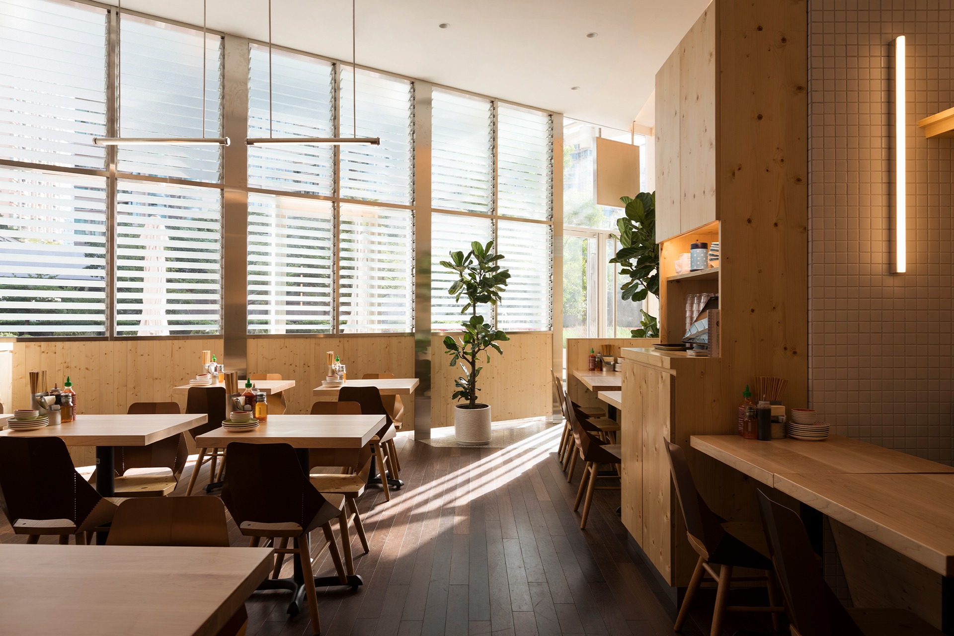 BÊP Olympian City brings Hong Kong's edgy Vietnamese cuisine brand from Central, across the harbour, to Kowloon-- catering a market looking for casual, fresh, and easy Vietnamese fare. JJA / Bespoke Architecture adopted the brand's existing interior concept for its largest site yet- set street side within a vast mixed-use development of shops and high-rise residences, typical of the Hong Kong context. The studio's goal was to create a journey of intimate spaces from the mall's interior corridor to the outdoor seating area on the shop's street side, while keeping the brand's preferred colours and material choices. A first for the restaurant, JJA / Bespoke Architecture, utilises pivoting glass blinds to create an architecture that is unique to brand, while helping separate the restaurant from the harsh shopping mall's shell. Hardwearing and low-maintenance plants were also added to give a sense of warmth and domesticity to the interior space.