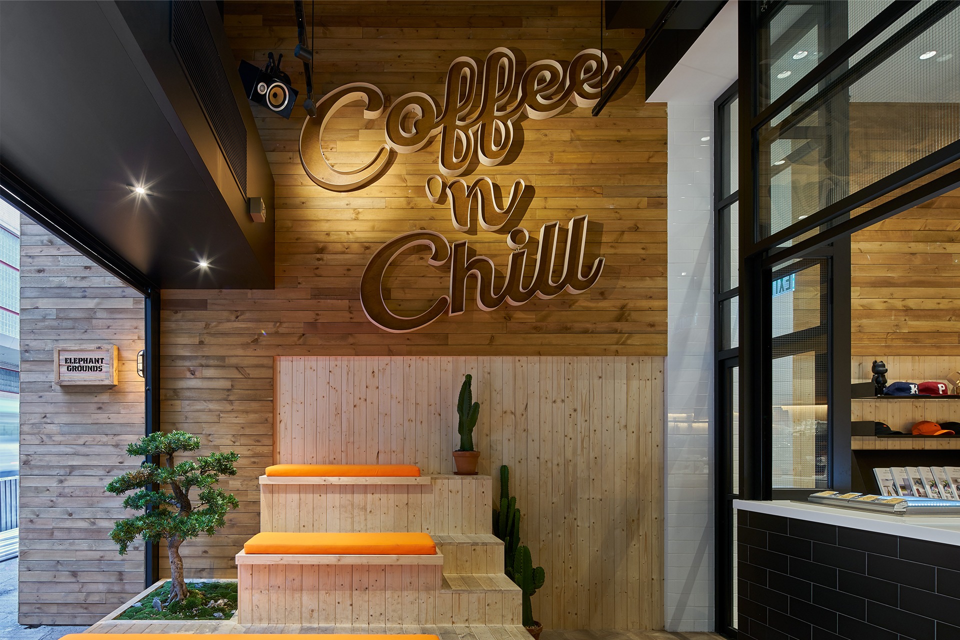 位處中環的Elephant Grounds Coffee是JJA / Bespoke Architecture成立兩年內的第二個香港標誌性咖啡廳項目。 該項目是JJA / Bespoke與Elephant Grounds的創辦人Kelvin Poon潘世亨先生共同設計而成。這間全新的旗艦店將兩層高的空間劃分出一系列的生活化空間,不僅顛覆了香港下舖上居餐廳的典型模式,把這些空間展露在顧客面前;更營造了一種賓至如歸的感覺。首先會吸引顧客視線的是以台階式座椅設計的等候區,由面向行人道的一側圍繞進點餐區;其次為處於店鋪正中央心臟位置的開放式廚房與咖啡吧,方便接待入座於不同位置的顧客;主要的用餐區則是圍繞開放式廚房而建。望向上層則能看見一個休閒式生活閣樓,讓顧客能在安靜的環境下放鬆身心。最後是位於餐廳靠後位置的露天平台花園,便完成餐廳一系列的家庭式體驗了。