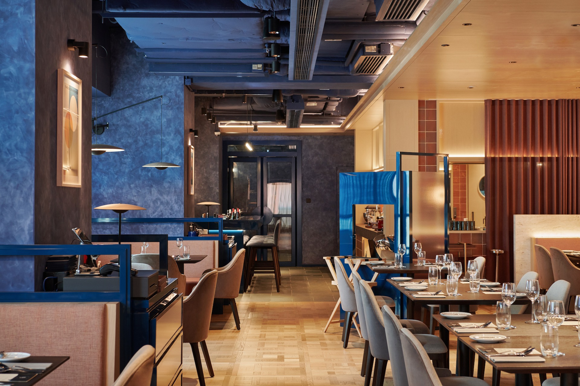 Even the colours were a fun mix. “It was important to choose colours that Chef Peter is comfortable with. We used muted blue, navy, grey, beige, black, brass, and dusty orange. I think there's a certain masculinity, but overlayed with a sense of playfulness and joviality.”