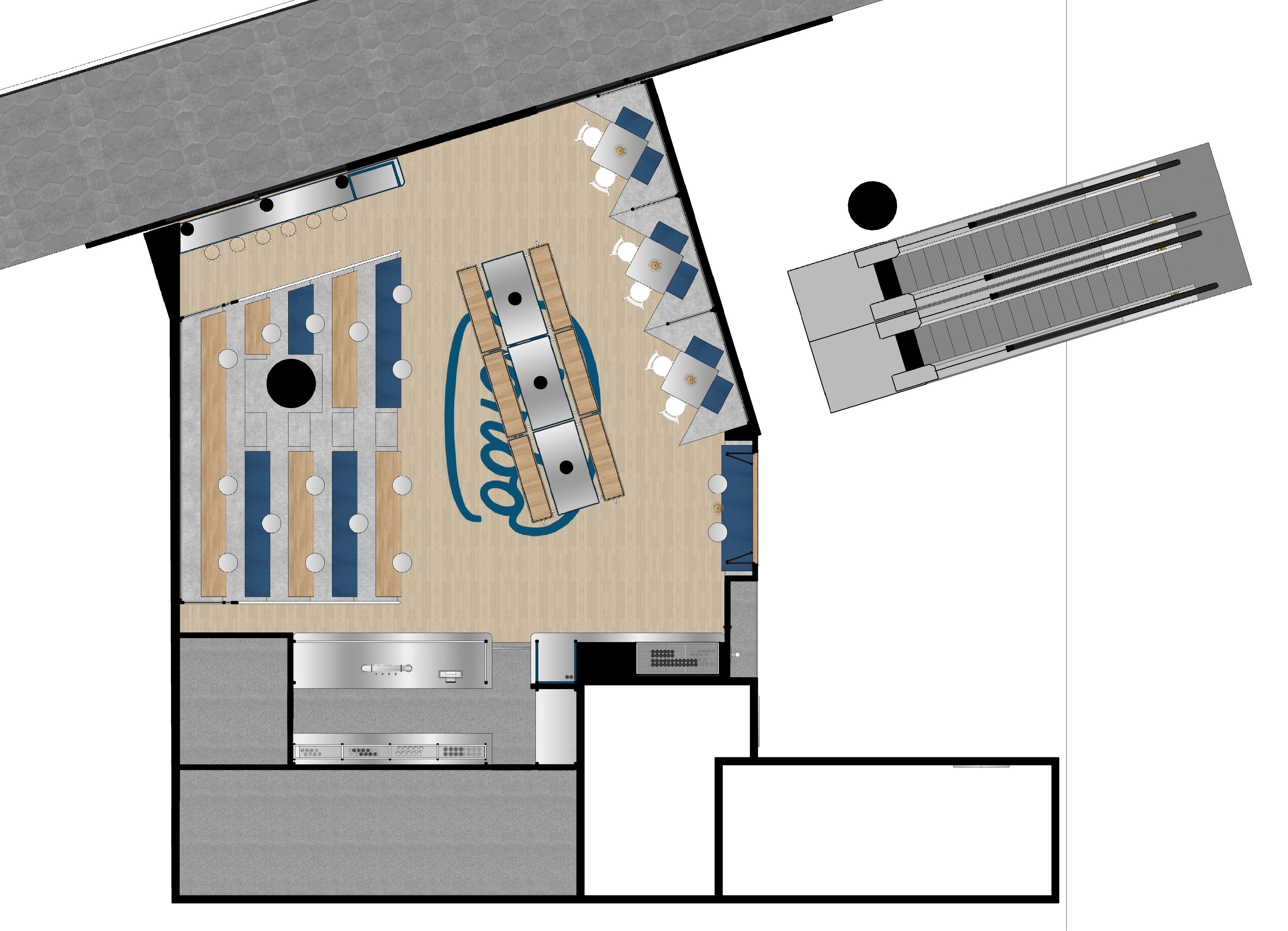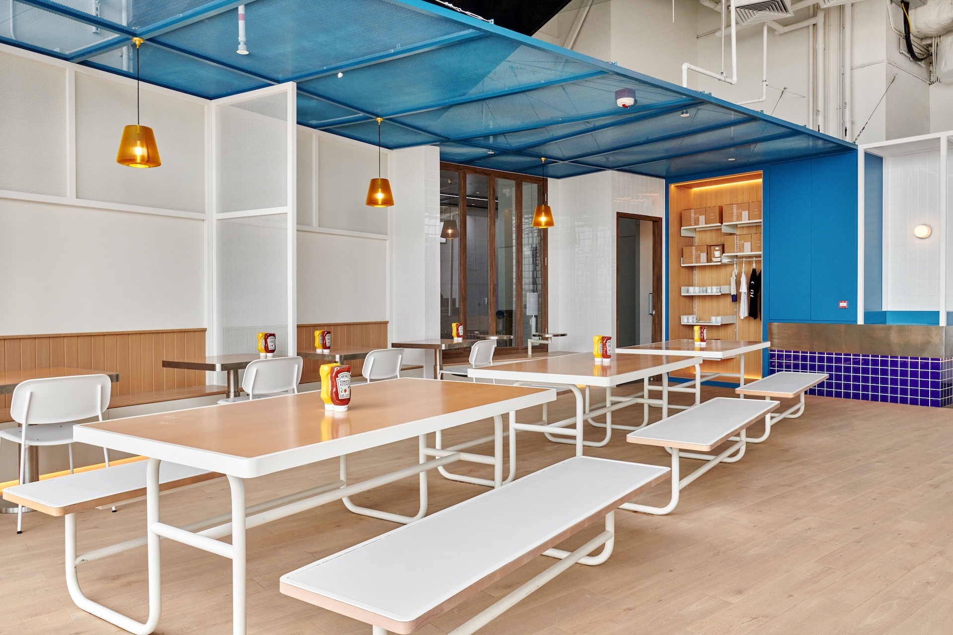 Honbo Macau proudly embraces the signature design elements that define the brand, including the iconic Honbo Blue, Oak timber features, metal mesh detailing, ceramic tiles, crisp white walls, concrete finishing, and vibrant neon lights, consistently found across all Honbo locations. Drawing inspiration from the iconic White Castle hamburger shops of the United States in the early 1930s, the interior design exudes a sleek and streamlined aesthetic.