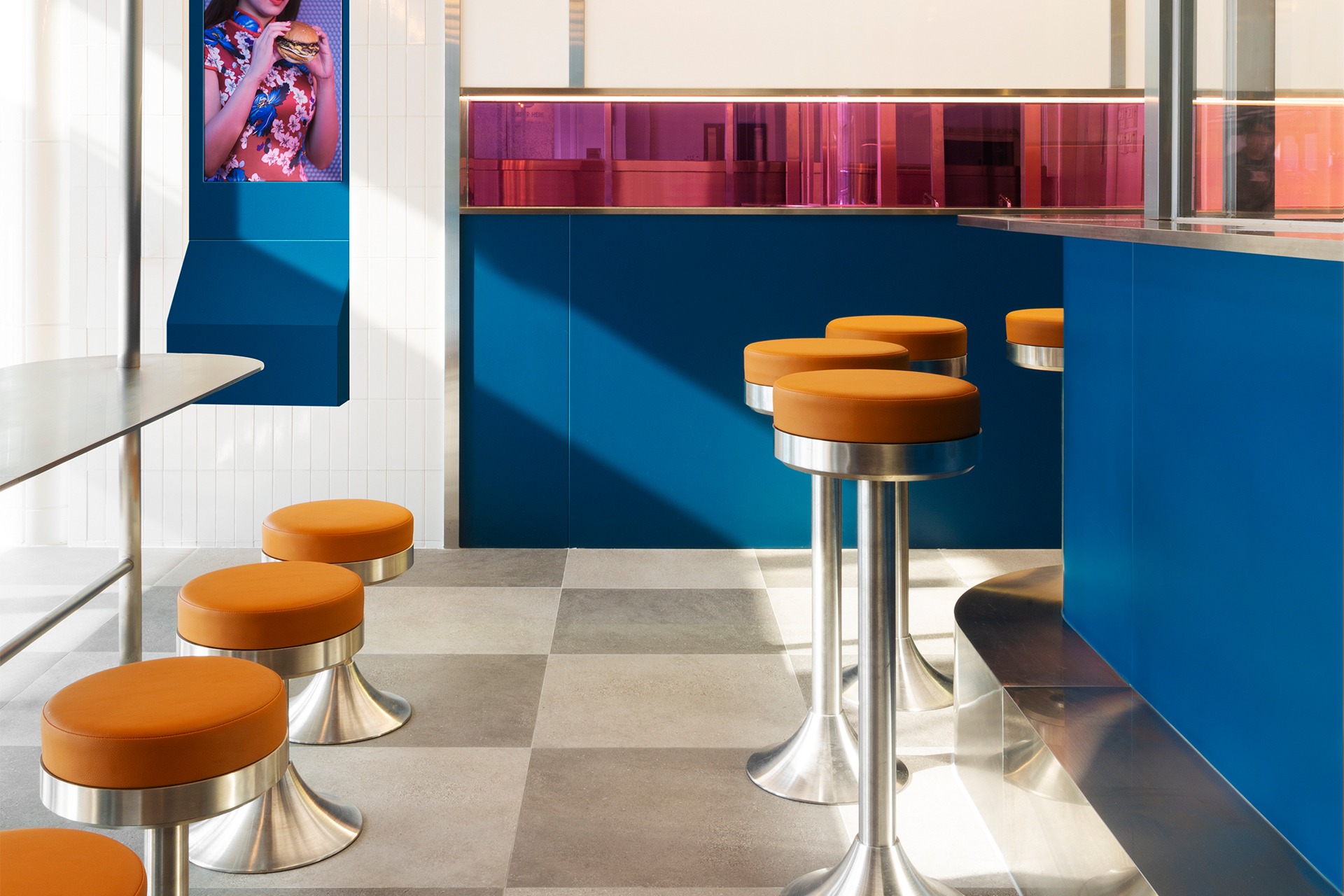Designed by James JJ Acuna for JJ Acuna / Bespoke Studio, HONBO at The Mills aims to align with the site’s history-focused mission by placing the restaurant in a new but familiar context, looking back towards the roots of "Fast Food Architecture", when guests ate hamburgers roadside in the Futurist Streamline Modern-meets-Art Deco interiors of America’s early 20th century diners. The project’s white and stainless steel finishes gives homage to the idea of creating a clean and safe place for fast food that is slick and sharp, yet with pop and style, elevating the brand to the next level with its aesthetics and material application.