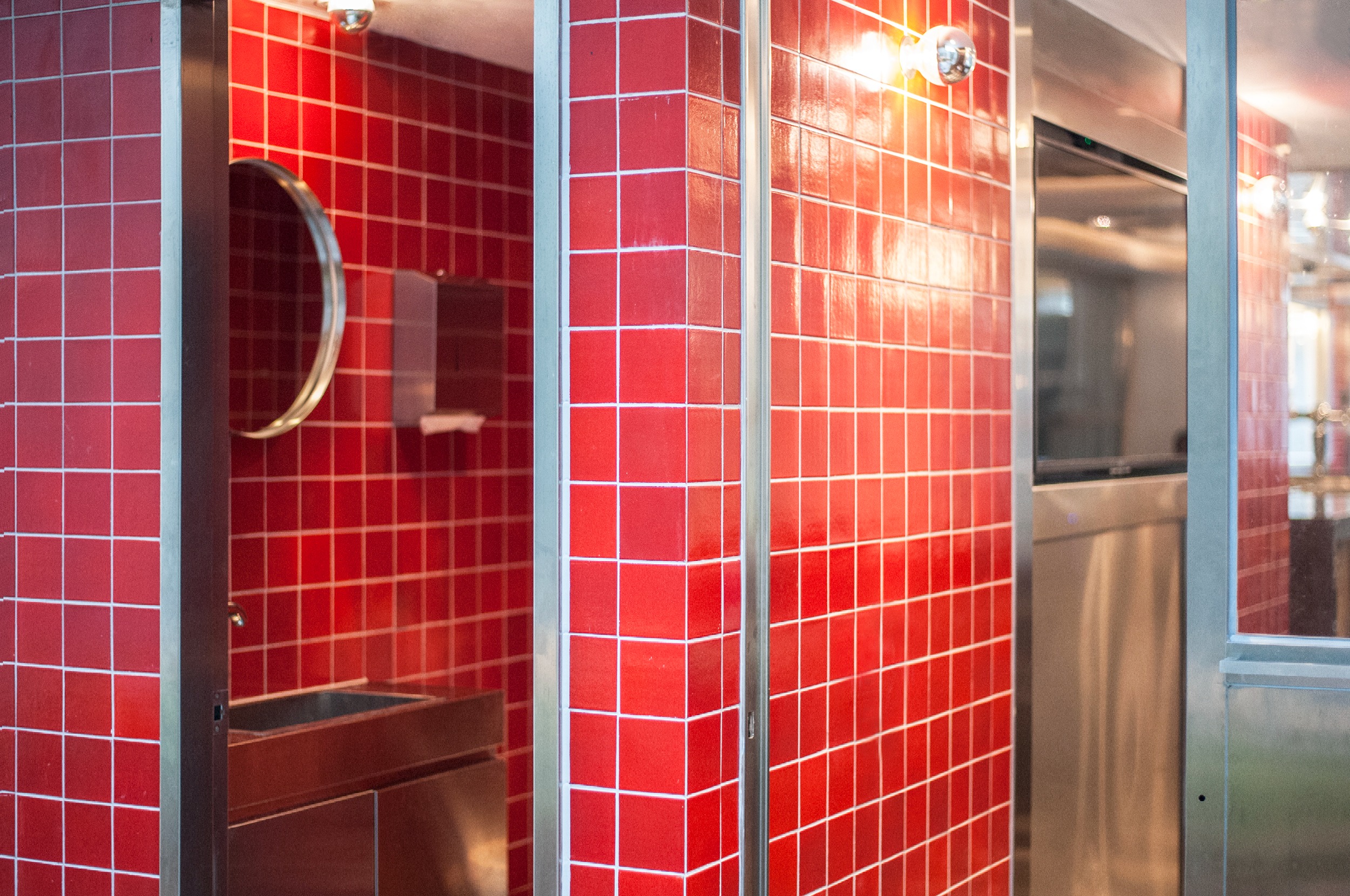 The project's interiors, designed in collaboration between JJA Bespoke Architecture, Morty's and Kevin Poon, focuses on pushing the site's existing back-of-house kitchen towards the front-of-house, so passersby can peek in through the restaurant’s kitchen window from the sidewalk. Looking to a variety of Manhattan's local pubs and diners as inspiration, the team focused on utilising a simple and straightforward colors and materials palette; such as the liberal use of red ceramic tiles, brushed stainless steel, and monochromatic stone flooring. These materials are used to great effect for the long and linear "train-car" type "dining cabin" that the restaurant's patron seating area is inspired by. Everything in the project is created bespoke for the site, except the silver-coloured Aluminium Prouve Chairs sourced from Industry West.