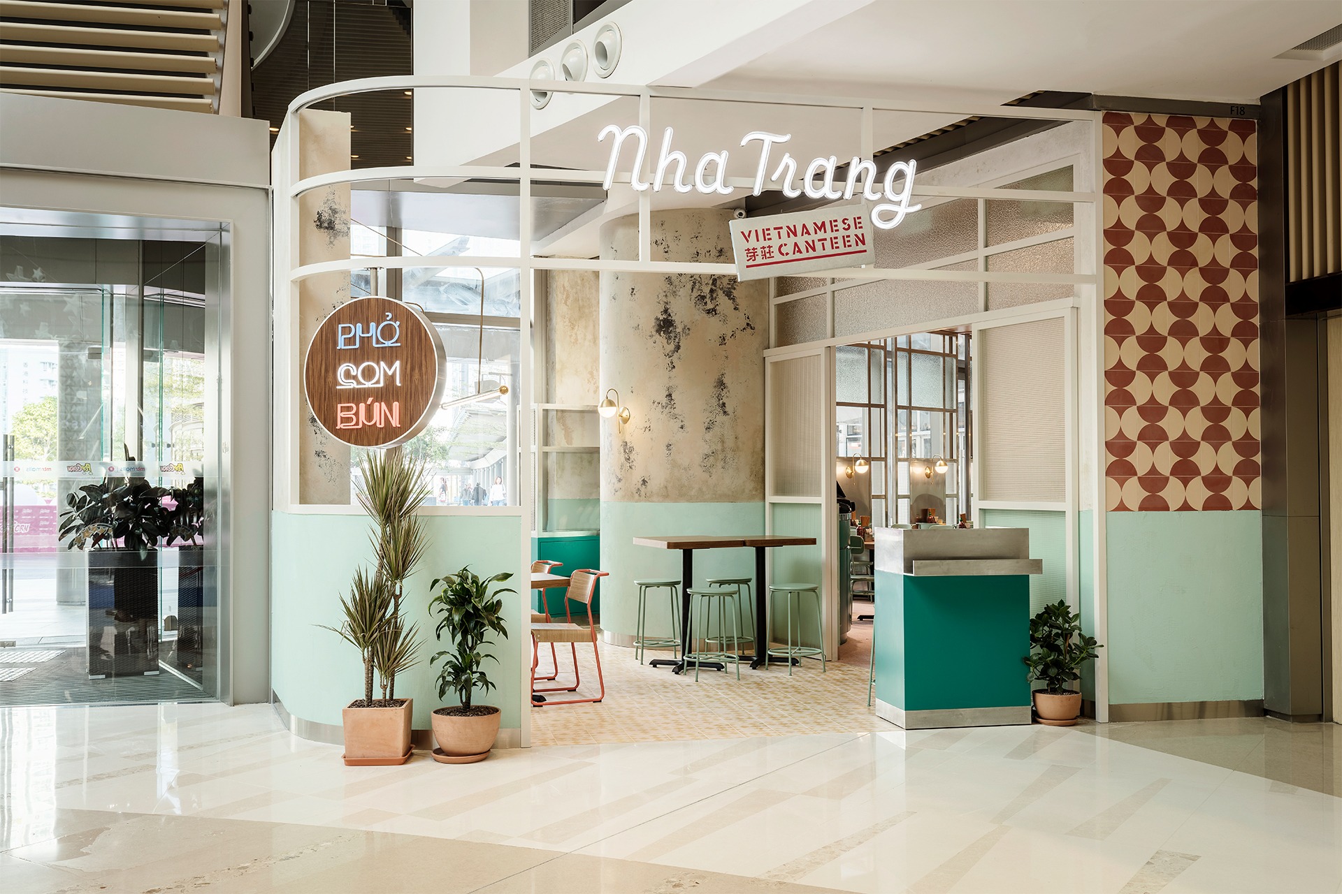 Because of the shop’s unique location, set centred within a heavily trafficked shopping mall atrium, part of the planning brief was to create a branded outdoor seating area (OSA) within the mall's atrium space, placed adjacent to the typical restaurant's interior floor plan. This allows the design to reference Vietnam's old-colonial urban homes, which are generally found inside small streets, and using this as a way to create an indoor-outdoor garden zone for outside dining. A well defined entrance portal divides this garden space from the interior’s domestic oriented environment, bringing guests to a home-like atmosphere supported by Architectural window frames in stainless steel, low-wattage gold wall sconces, and mid-century modern concrete tiles for feature walls and some romantic flare. The restaurant's open kitchen is positioned in the centre of the plan, and can easily be appreciated by all diners sitting within the interior space. The design was executed in collaboration with RoanoakCo and Cedar and Moss for lighting, VG&P for chair fabrication, India Mahdavi for Bisazza for Feature tiles, and artist Elsa Jeandedieu for all antique wall renders.