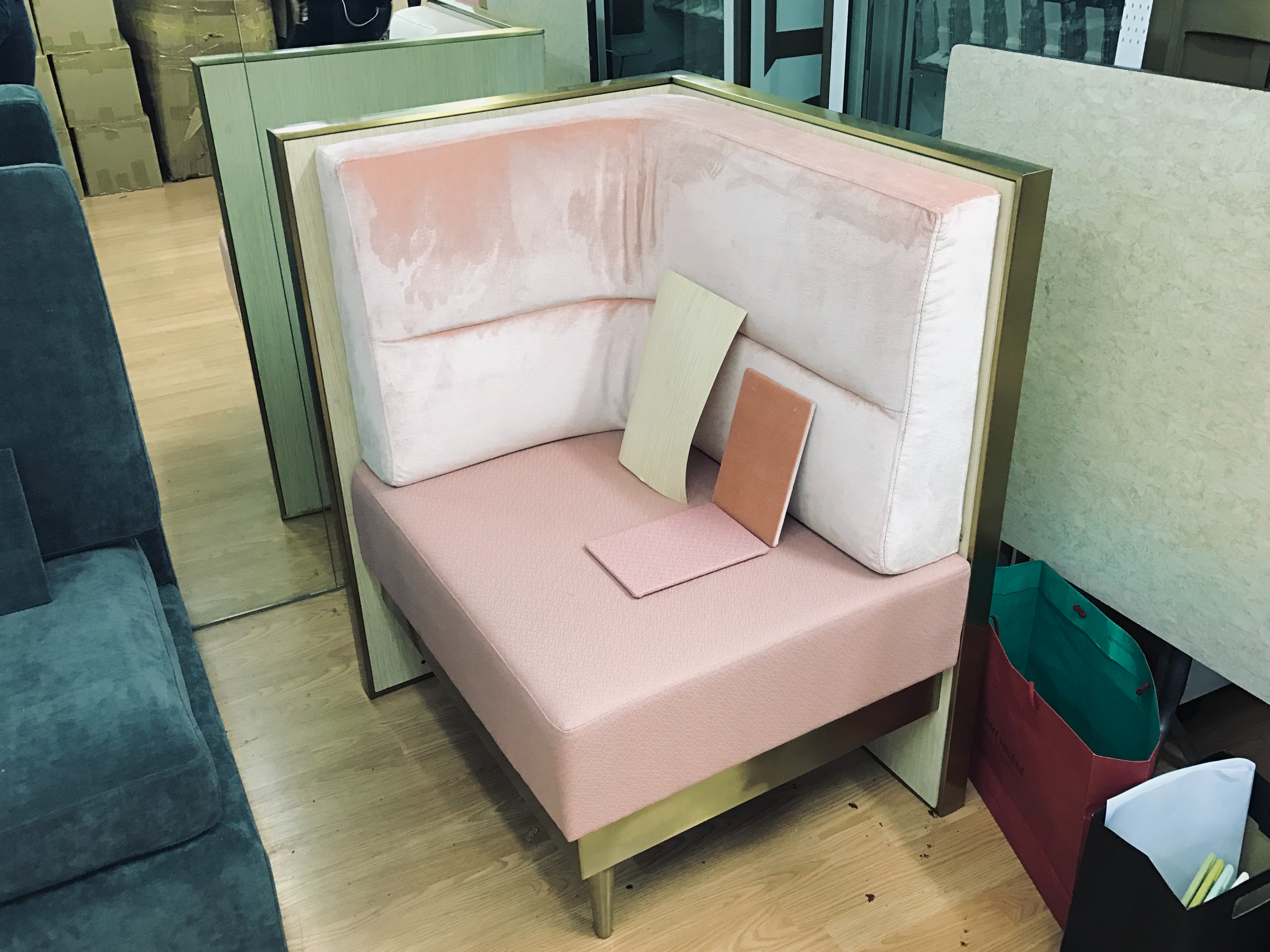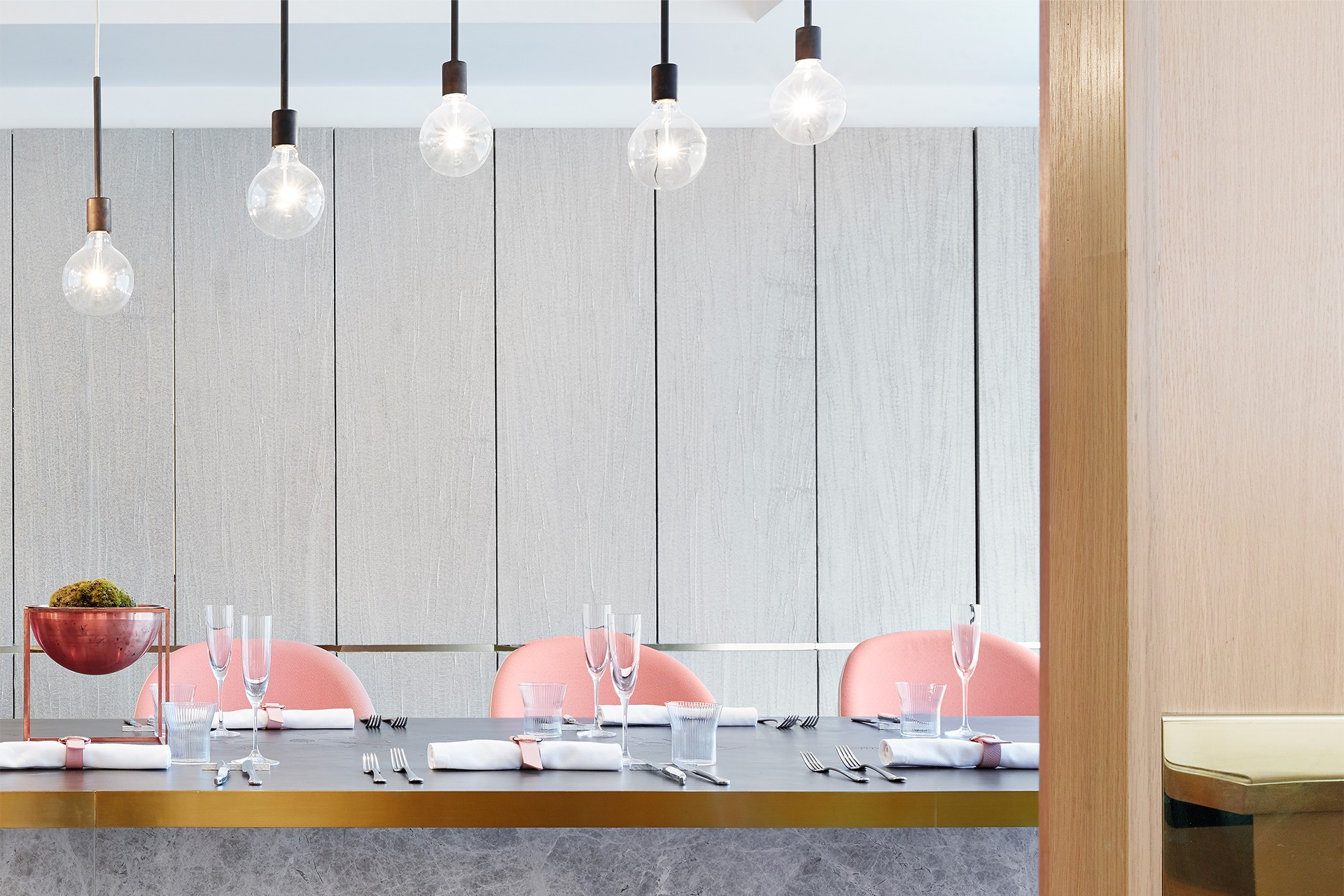 The TATE Dining Room and Bar, is a Version 2.0 for Chef Lau and a first for Acuna, taking a small scale Chef's fine dining kitchen to a front-of-house space spanning 2,200 square feet in the heart of the city's historic, cultural, and foodie neighborhood, Sheung Wan. The colour tones are reflective of Chef Lau's feminine oriented palette of whites, nudes, pinks, brass, and greens. Acuna planned the two-storey space as a journey which re-orients the visitor through a sensuous curvilinear initial pathway on the ground floor followed by a series of timeless rooms, a cross between art gallery environments and domestic spaces -- a reflection of Chef Vicky Lau's concept of enjoying visually playful food in a home environment.