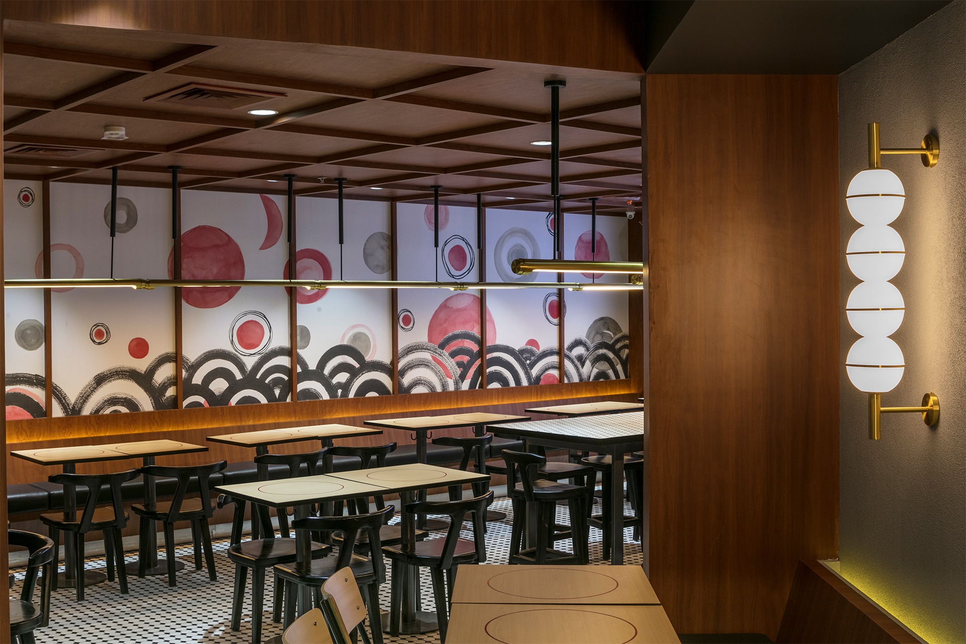 Part of our process was to look into interior formal references of "Pop-Japan" whether it be having to review Mid-Century and International style projects with that Japanese twist, like the famous Hotel Okura, or take cues from non-Japanese films like the 1982 epic, "Blade Runner", or perhaps even review the Japanese detailing of Fusama Screens, or Fusama painting cultures, as well as the planning of Minka Homes. The idea was not to copy any of these references, but find the ways in which a customer or guest may appreciate their forms, their planning methods, lighting methods, or formal styles and see what a combination of these ideas can make a restaurant work the way it needs to work, while creating a space with touches of Japanese-ness but through a Filipino cultural lens.