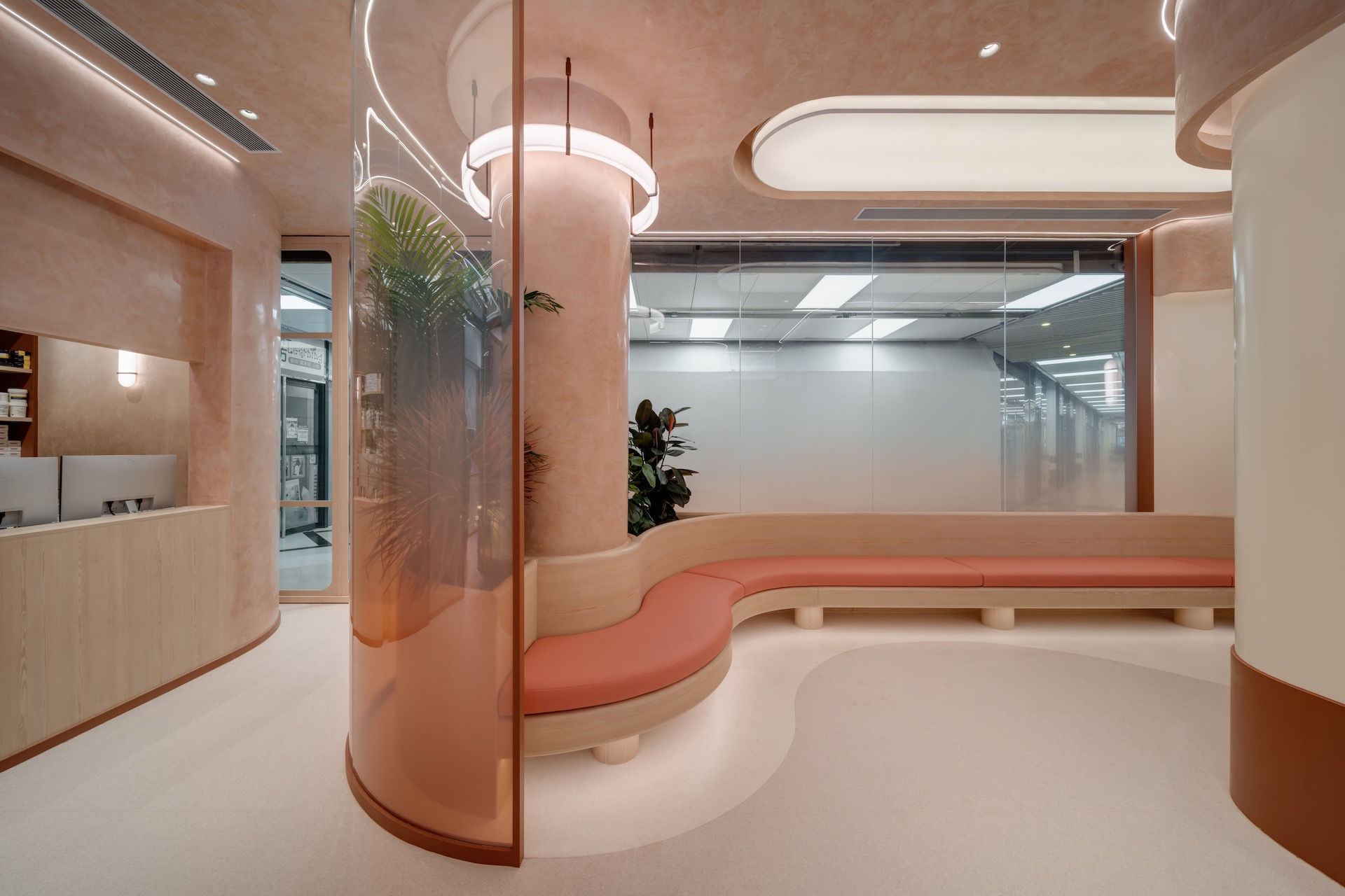 The enclosed hallway allows guests to leave their busy lives behind to focus mainly on their wellness journey. Design details like gradient fabrics, textured paints, artful wall-covering, fresh plants, and circadian lighting, all contribute to the ease of wellness and its prime importance to our lives.